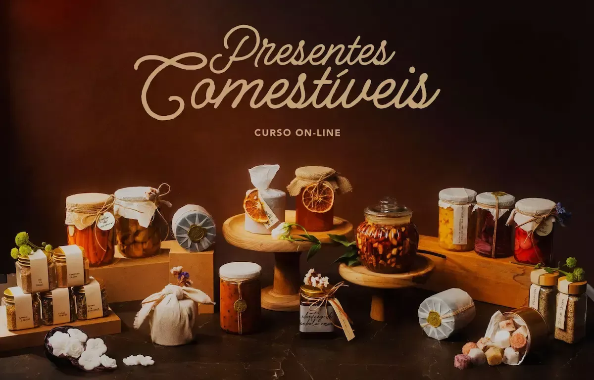 Mais do que receitas, este curso ensina a surpreender: geleia de Negroni, sal de bacon, pó de cogumelos, picles, chutney com vinho, doces cristalizados, torrões de açúcar com flores e especiarias e muito mais. Embalados com técnicas que transformam cada presente em uma experiência única.